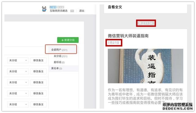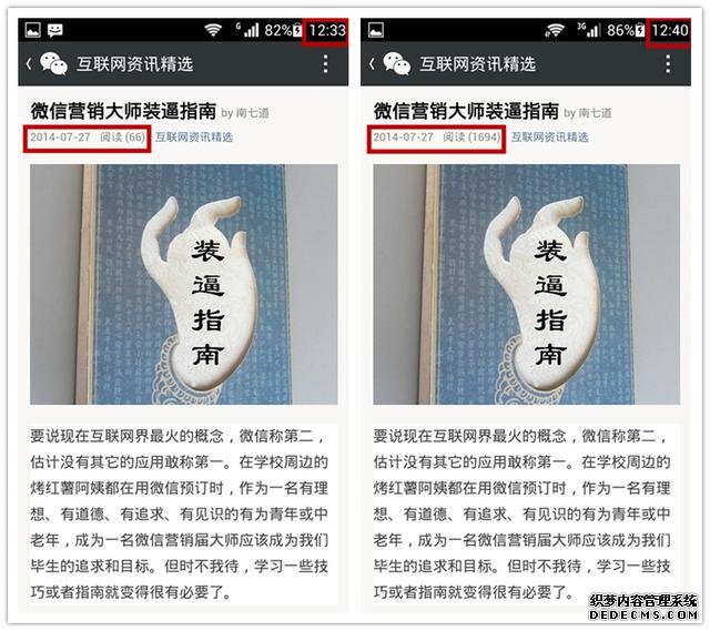 接着看看阅读量前后的对比,大家可以看下图片右上角的时间对比,从7.27上午11:34发布了一条群发信息,截止到12:33分,阅读数量只有66,但到12:40时,阅读量已经涨到1694个,所以对于只有201个粉丝的帐号来说,这个数据也只有可能是刷上来的:
