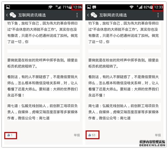 以下是点赞前后的对比,大家可以看下图片右上角的时间对比,从7.27上午11:34发布了一条群发信息,截止到12:06分,点赞量只有1个,但到12:33时,点赞已经涨到53个,对比微信大号的文章,小米手机的“不锈钢金属边框全球最快小米4开卖”有76280的阅读量,只有1111个点赞,所以对于只有201个粉丝的帐号来说,这个点赞数据只有一种可能,是刷上来的: